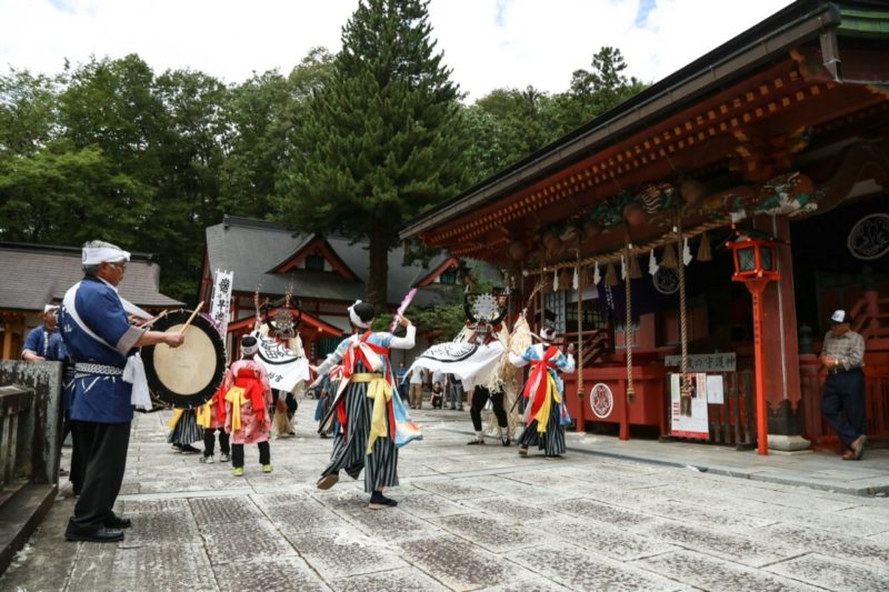 文治5年(1189)に奥州藤原氏追討に功あり、遠野郷を賜った阿曽沼氏が創建したと伝わる古社。9月の遠野まつりでは、一周450mの広大な馬場を会場に、1335年創始と伝わる遠野南部流鏑馬を始め、神楽やしし踊り、南部ばやし、さんさ踊りなど、約40団体もの郷土芸能団体が一堂に会して披露される。近年猫神社が創建され、日本各地から猫好きの方の参拝が絶えない。