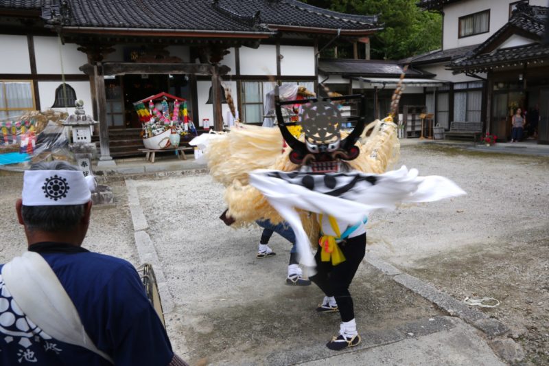 お盆に行われる、しし踊りによる供養の舞。位牌ぼめともいう。故人を偲ぶ哀愁漂う動きと、静かな太鼓、笛、歌が夏の空に響く。