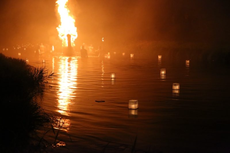 お盆期間中はしし踊りも各地で行われ、「墓じし」とも「位牌ぼめ」とも言われる鎮魂の舞が行われる。そこにシシの荒々しさはなく、故人を偲ぶような苦悶の動きをするシシが印象的だ。他にも「新精霊(みそうろう)」という風習を行う地区では、故人の家と墓前を男たちがめぐり、火を焚きながら切ない音色にのせて鎮魂の歌を歌う。新精霊は故人の年齢や性別によっても歌詞が変わり、例えば若い年齢で亡くなった場合、「つぼみが開かぬうちに散ってしまった花」という表現が用いられる。お盆の最後、送り盆では「舟っこ流し」という灯篭流しが行われ、火を灯す舟とともに魂はあの世へとまた戻っていく。