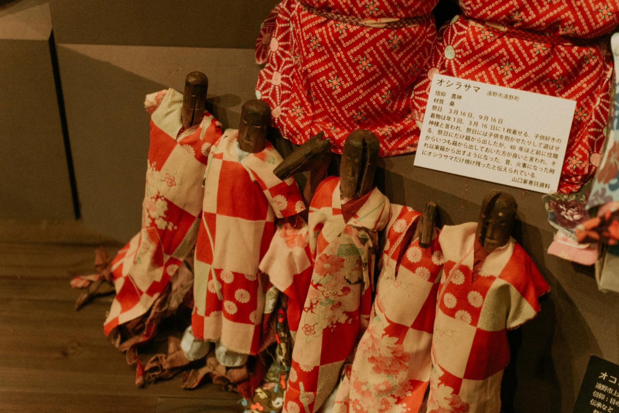 Prayer for livelihood: Tōno has another deity named Oshira-sama. They resemble wooden sticks wrapped in cloth, some existing for over 500 years. Oshira-sama is known as the deity of sericulture, the curing of eye diseases, and divination, as shamans employed them as ritual tools. In former times, fishermen would consult Oshira-sama for guidance on where to fish. In “The Legends of Tōno”, Oshira-sama is explained through a tragic love story between a horse and a girl; the origins of the tale are quite complex. Such complexity is the characteristic of folk beliefs, arising from local people’s struggles with life and the prayers offered to deities each time they faced hardship.